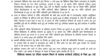 चिकित्सा शिक्षा विभाग उत्तराखण्ड के नर्सिंग अधिकारी (महिला/पुरुष) डिप्लोमाधरक / डिग्रीधारक के रिक्त 1455 पदों पर 09 जुलाई 2024 से…